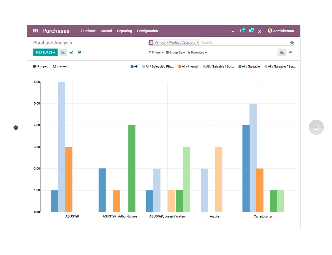 Plan your orders efficiently with precise forecasts and analysis. Have detailed and accurate statistics on your suppliers’ performance through flexible reporting that includes delays in delivery, negotiated price discounts, purchased quantities and more. Study your contracts’ profitability by integrating purchases with analytic accounting.